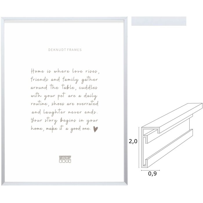 Hliníkový rám v matné stříbrné barvě, velikosti 10x15–30x40 cm, sklo, MDF zadní stěna, závěs i stojánek, šířka profilu 0,9 cm