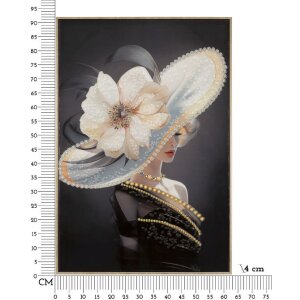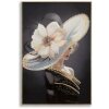 Fototapeta "Vídeňský klobouk" s rámem, 62x4x92?cm, kov, jedlové dřevo a plátno, černá a zlatá barva, žena s kloboukem a květinou, strukturovaný povrch, elegantní a expresivní.