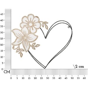 Nástěnný panel 50x2x45 cm, železo a MDF, hnědá a černá barva, 3D tvar srdce s dřevěnými květinovými detaily, romantický a přirozený pro krásné akcenty v místnosti.